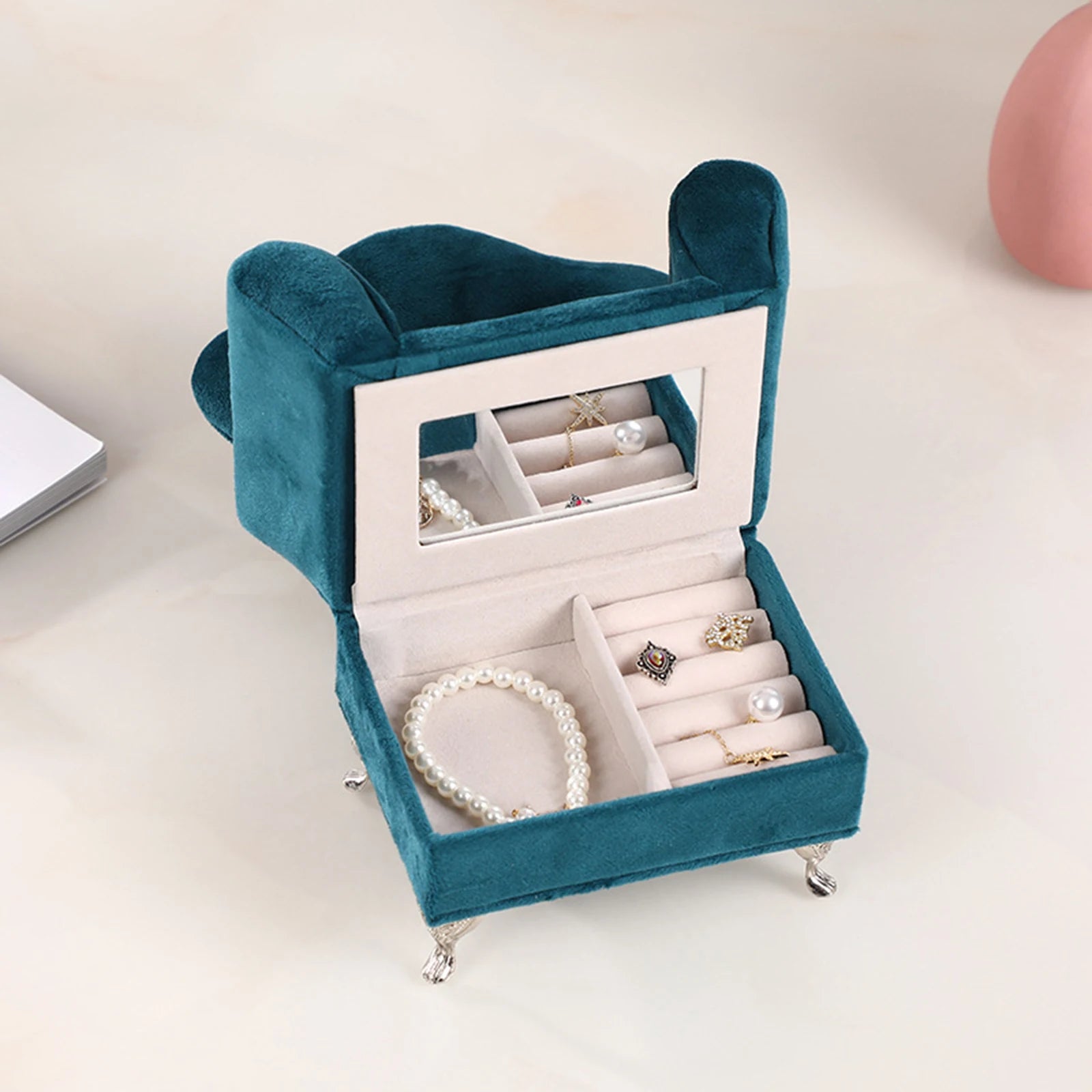 ELEGANT LOOK: Lovely Sofa Couch shape jewelry storage case with mirror, suitable for dresser, bedside table, bathroom, vanity table decoration.