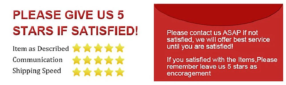 1. Please leave 5 star feedback if you're satisfied with our products and service, we will appreciate it (Item as Described 5 stars, Communication 5 stars, Shipping time 5-stars).