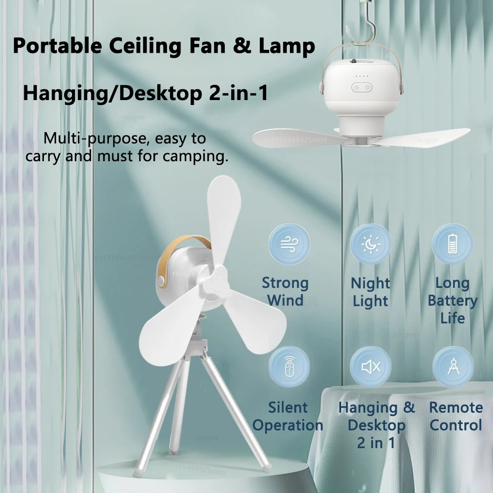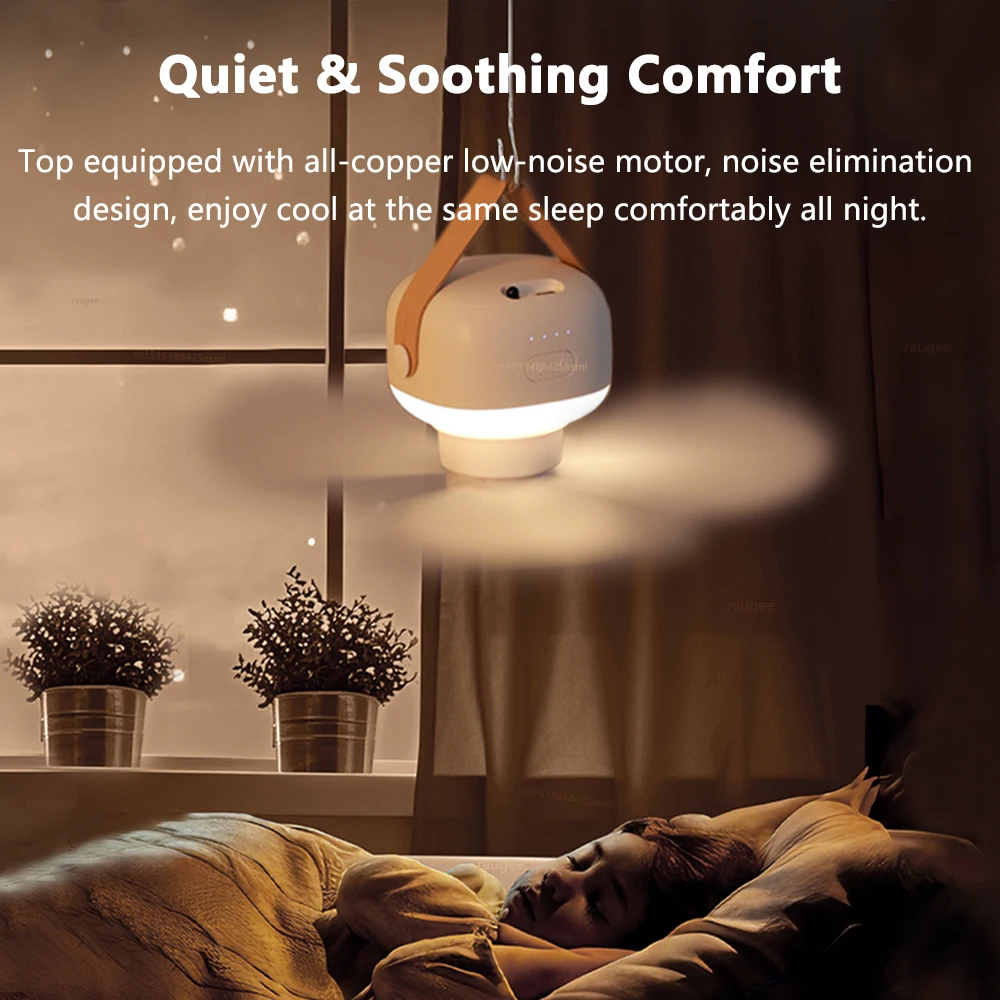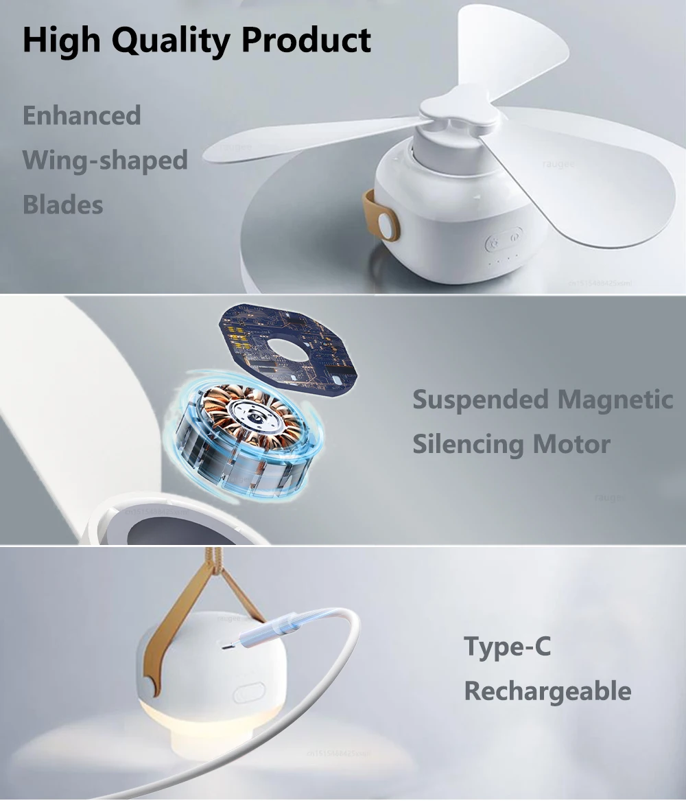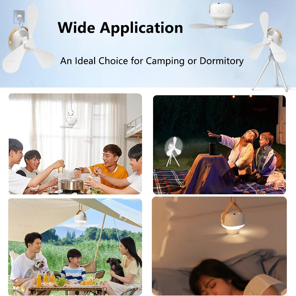 HIGH QUALITY & RECHARGEABLE — portable ceiling fan is composed of ABS+PP and all-copper motor. Advanced three-blade fan can concentrate airflow more intensively。The fan provides a lot of airflow while being quiet. Built-in 7200mAh rechargeable battery can work for a long time.