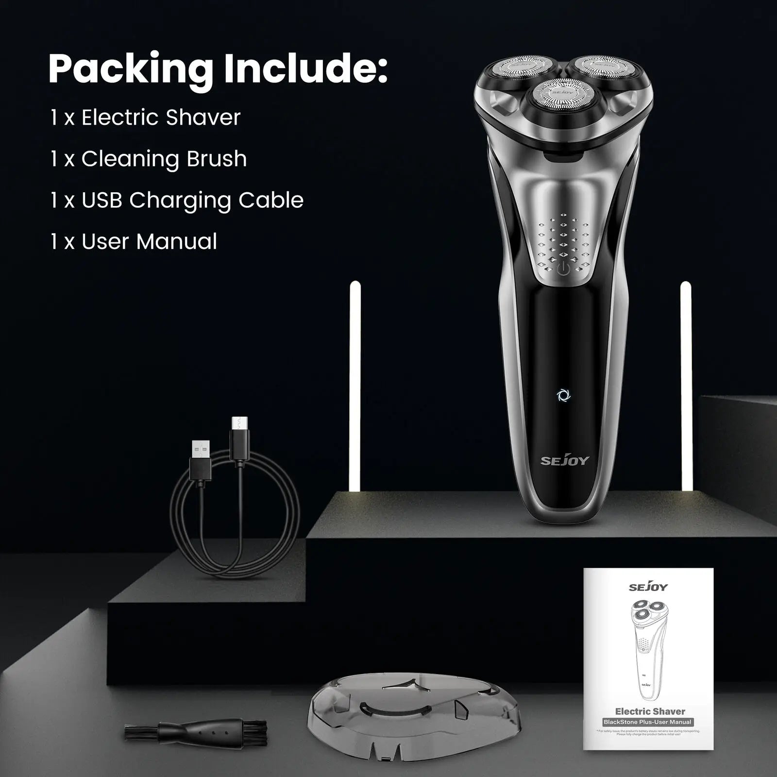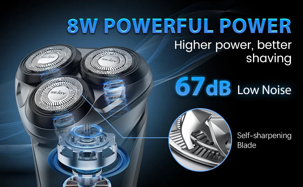 3D floating pivoting head automatically adjusting to every curve of your face and neck,creating smooth contact with your skin.Dual-track cutter gently conform to facial contours, for enhanced shaving comfort.Durable, self-sharpening precision blades —for fast, efficient shaving.