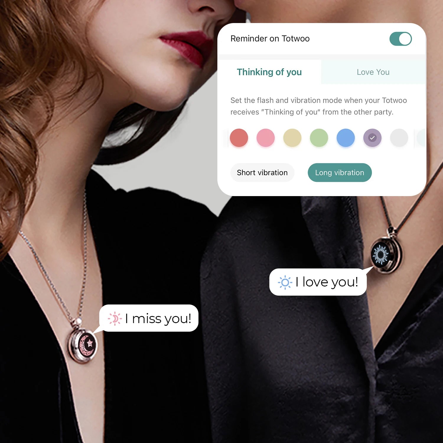totwoo allows the necklace to flash and buzz on your preference. The light and vibration intensity are adjustable. Wear your partner's love and touch, always at ready to feel.