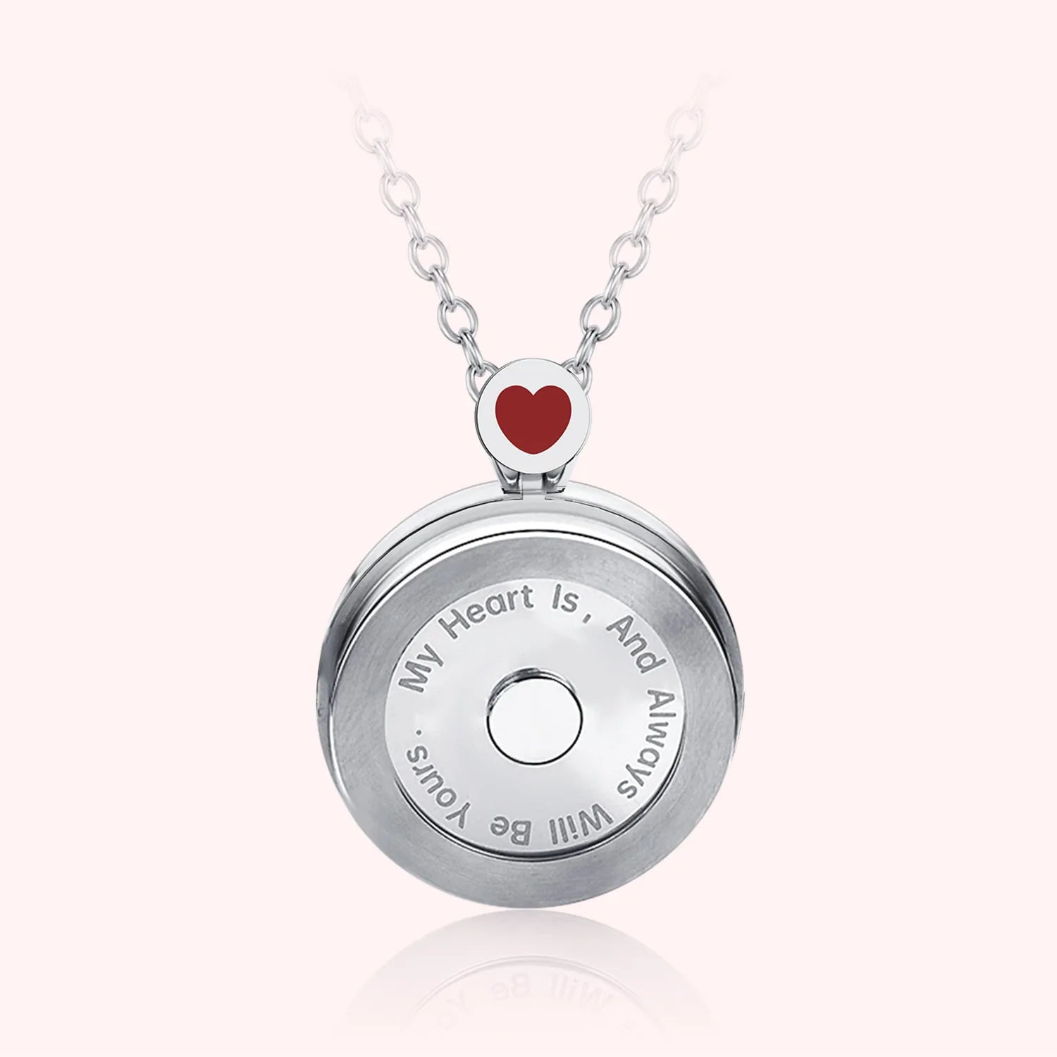 Engraved with Jane Austen's quote, “My heart is, and always will be yours” on the backside with a red enamel tiny heart.