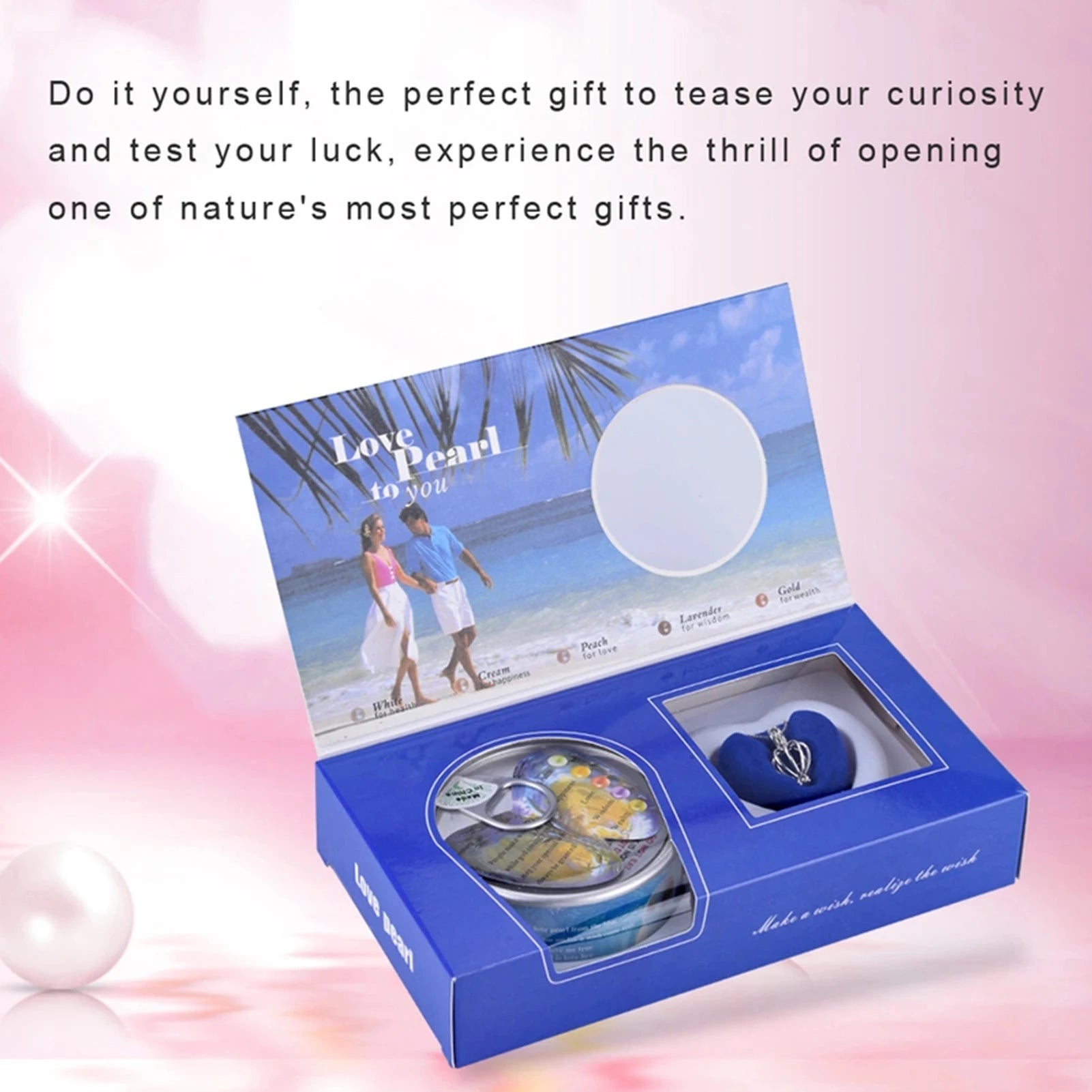 Please make a wish and take the pearl out of the pearl shell, white pearl brings you wisdoms, cream pearl brings you successes, peach-pearl brings you health, gold pearl brings you wealthness, lavenders pearl brings you love.